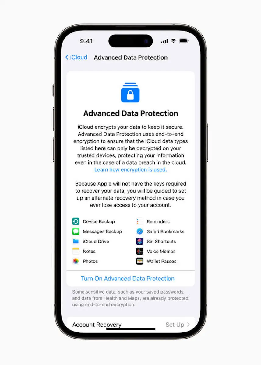Sous le nom de Protection avancée des données, Apple a déclaré qu’elle étendait les capacités de chiffrement d’iCloud de 14 « catégories de données sensibles » protégées par un chiffrement de bout en bout à 23 catégories supplémentaires ; ces dernières comprendront les sauvegardes, les contacts, les notes, les photos, les mémos vocaux et les cartes ou pass contenus dans le wallet. Auparavant, les capacités de chiffrement de bout en bout d’iCloud ne s’appliquaient qu’aux données plus sensibles, comme les mots de passe du trousseau iCloud et les données de santé personnelles, ce qui n’est pas des plus rassurant.