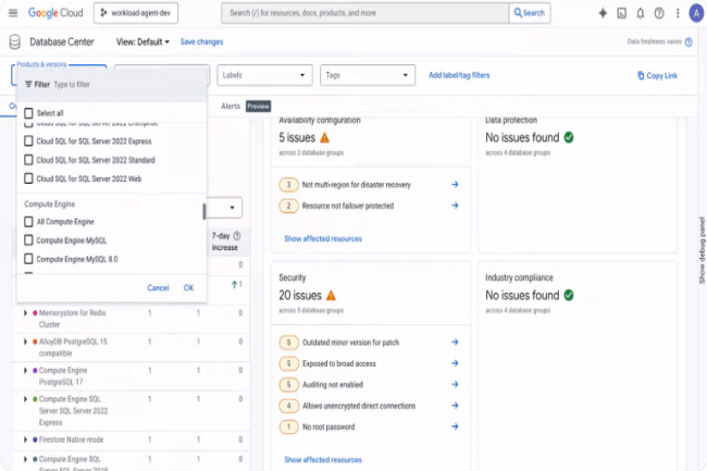Dans la dernière mise à jour de Database Center, Google Cloud propose de surveiller les VM exécutant les bases de données auto-gérées. Elle comprend aussi d’autres fonctionnalités pour les alertes ou la comparaison historique du parc.