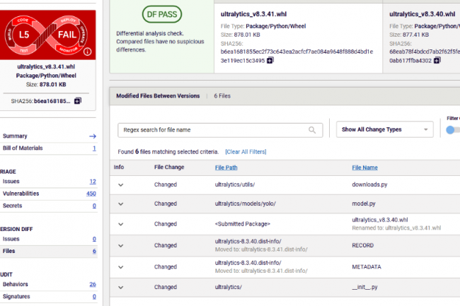 Les attaquants semblent également avoir utilisé une technique d’empoisonnement de cache pour persister dans leurs modifications via GitHub Actions que M. Khan avait documenté en mai dernier sur son blog personnel. Selon l’analyse du code malveillant par ReversingLabs, l’attaquant a modifié deux fichiers : downloads.py et model.py. Le code injecté dans model.py vérifie le type de système sur lequel le paquet est déployé afin de télécharger une charge utile destinée à cette plateforme et à son architecture processeur. Le code malveillant effectuant le téléchargement de la charge utile est stocké dans downloads.py. « Bien que dans ce cas, sur la base des informations actuelles dont dispose l’équipe de recherche de RL, il semble que cette charge malveillante servie était simplement un mineur XMRig, et que la fonctionnalité de hack était destinée au minage de crypto-monnaie », écrivent les chercheurs de ReversingLabs. « Mais il n’est pas difficile d’imaginer l’impact potentiel et les dommages si les acteurs de la menace décidaient d’implanter des logiciels malveillants plus agressifs comme des portes dérobées ou des trojans d’accès à distance (RAT). » Le rapport de ReversingLabs inclut des indicateurs de compromission et des hachages de fichiers pour détecter l’infection. Les systèmes qui ont déployé Ultralytics 8.3.41 et 8.3.42 devraient faire l’objet d’un audit de sécurité.