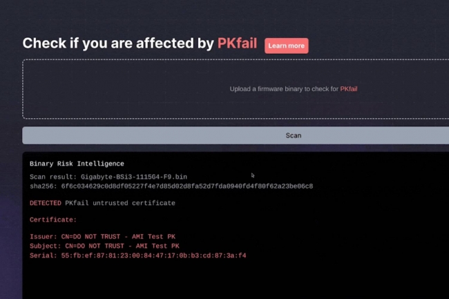 Binarly a mis en place un scanner en ligne permettant aux utilisateurs de soumettre des copies du micrologiciel de leur carte mère afin de vérifier s’il utilise une clé de test, et une liste des modèles de cartes mères concernés est incluse dans le bulletin de l’entreprise. Malheureusement, les utilisateurs ne peuvent pas faire grand-chose tant que les vendeurs n’ont pas fourni de mises à jour du micrologiciel avec de nouvelles clés de test générées de manière sécurisée, en supposant que les modèles de leurs cartes mères soient encore pris en charge. La première utilisation de ces clés de test trouvée par Binarly remonte à 2012.