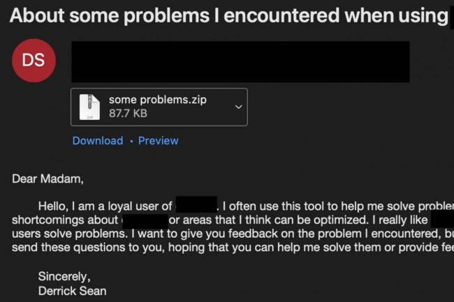 Les victimes sont ciblées via un courrier électronique ayant pour objet l’IA, dans lequel les attaquants se présentent comme des utilisateurs d’un outil que les victimes connaissent bien et demandent de l’aide pour résoudre un problème. Les courriels contenaient une pièce jointe ZIP malveillante contenant un fichier .LNK (raccourci Windows). Les fichiers LNK servent souvent à distribuer des logiciels malveillants, car ils sont capables d’exécuter des commandes shell. Dans le cas présent, le fichier LNK contient des paramètres de ligne de commande permettant d’exécuter un code JavaScript qui agit comme un dropper de logiciel malveillant.