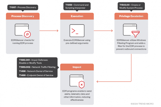 Développé pour les tests de pénétration et les exercices des équipes offensives en cybersécurité (red team), EDRSilencer a été trafiqué par des pirates afin d’améliorer leurs attaques. Cet outil exploite la plateforme de filtrage Windows Filtering Platform (WFP) pour bloquer la communication réseau des agents logiciels EDR, les empêchant ainsi d’envoyer des données télémétriques ou des alertes aux consoles de gestion surveillées par les équipes de sécurité.
