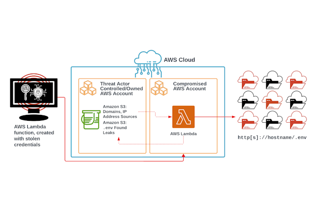 AWS Lambda est une plateforme serverless conçue pour provisionner automatiquement les ressources cloud en fonction de l’application fournie par l’utilisateur. Elle a déjà été utilisée de manière abusive par des attaquants pour le minage de crypto-actifs avec des mineurs écrits en Go, mais dans ce cas, les pirates l’ont utilisée pour déployer un script bash qui analyse d’autres domaines à la recherche de fichiers .env exposés, en extrait les informations d’identification et les télécharge vers un bucket S3 public qu’ils ont précédemment compromis.