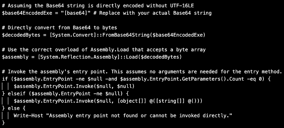 L’objectif de ce script secondaire était de décoder un fichier exécutable à l’aide de Base64 pour l’infostealer Rhadamanthys qui était stocké dans une variable, puis de le charger directement dans la mémoire et de l’exécuter sans l’écrire sur le disque. Ce type de technique de logiciel malveillant sans fichier (ou fileless) est couramment utilisé pour échapper aux moteurs de détection aux points de terminaison (Endpoint Detection and Response, EDR).