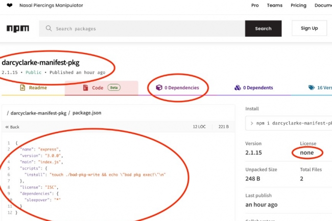 À la base, ce problème est dû au fait qu’il n’existe pas de « source canonique de vérité » claire pour les métadonnées d’un paquet, comme le nom, la version, les dépendances, les scripts, la licence, etc. Ces éléments sont spécifiés dans le fichier package.json qui est inclus dans l’archive du paquet elle-même et qui prend en charge les valeurs de vérification de l’intégrité telles que les hachages cryptographiques. Cependant, certaines de ces données peuvent être spécifiées dans le fichier manifest du paquet lors de sa publication sur le registre npm et ce manifeste dicte les informations que le registre affichera. Par exemple, Darcy Clarke a créé un exemple de paquet dont le fichier package.json mentionne un autre paquet comme dépendance, mais lorsqu’il l’a publié, il n’a pas inclus la dépendance dans le manifest. En conséquence, l’entrée du paquet sur le référentiel npm.js liste le paquet avec 0 dépendance, parce que le registre utilise le manifest comme source unique de vérité.