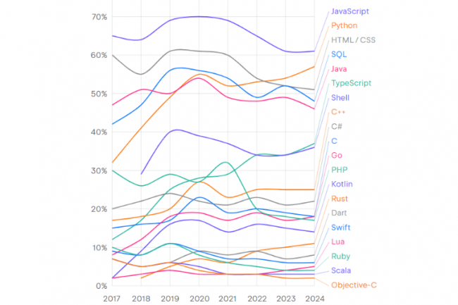 Selon le rapport State of Developer Ecosystem Report 2024 de JetBrains, JavaScript est encore le langage de programmation le plus utilisé. Mais TypeScript, Rust et Python présentent des perspectives de croissance les plus prometteuses.