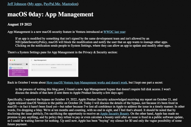 Dans un billet de blog, Jeff Johnson explique pourquoi il y a un lien entre la faille et le bac à sable des applications. Les logiciels en sandbox ne peuvent pas modifier d’autres programmes sans autorisation, mais, comme le détaille Jeff Johnson, Apple a placé le dossier Applications lui-même dans le bac à sable. Cette configuration permet aux applications sans bac à sable de modifier d’autres programmes et de contourner le contrôle effectué par App Management. Le développeur a créé un projet Xcode qui démontre la faille. Dans un billet d’octobre 2022, dans lequel il expliquait le fonctionnement d’App Management et les cinq façons dont une application peut obtenir des permissions, Jeff Johnson faisait déjà allusion à cette faille : il avait mentionné un sixième moyen d’obtenir des permissions, mais ne l’avait pas révélé à l’époque, car il s’agissait justement de cette faille du bac à sable.