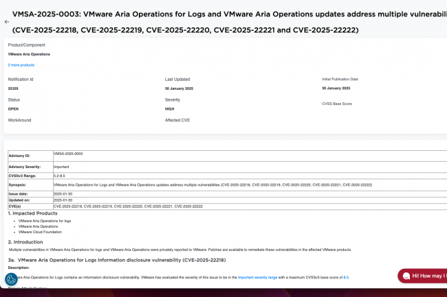 VMware Aria Operations for Logs contient également une vulnérabilité de script croisé (CVE-2025-22219) avec un niveau de gravité important (CVSS 6,8/10) et une vulnérabilité d’échelle de privilèges (CVE-2025-22220) avec un niveau de gravité modéré (CVSS 4,3/10). Un autre bug similaire (CVE-2025-22221), ayant également une note CVSS modérée de 5,2/10, affecte VMware Aria Operations for Logs et pourrait permettre à des acteurs avec des privilèges d’administrateur de lancer des scripts malveillants sur le navigateur de la cible. Toutes ces vulnérabilités ont affecté les mêmes versions de produits VMware Aria et VCF que les failles de divulgation d’informations, et ont été corrigées dans la même mise à jour. Broadcom a noté qu’il n’existe pas de solution temporaire pour ces bugs.