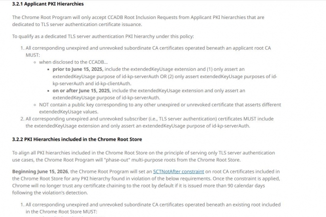 La déclaration de Google est rédigée dans un langage que la communauté de la certification devrait certainement comprendre : « Pour aligner toutes les hiérarchies PKI incluses dans le Chrome Root Store sur le principe de servir uniquement les cas d’utilisation d’authentification de serveur TLS, le programme Chrome Root éliminera progressivement les racines polyvalentes du Chrome Root Store. À partir du 15 juin 2026, le programme Chrome Root définira une contrainte SCTNotAfter sur les certificats d’autorité de certification racine inclus dans le Chrome Root Store pour toute hiérarchie PKI en violation des exigences ci-dessous », a écrit Google. « Pour réduire l’impact négatif sur l’écosystème, le Chrome Root Store peut temporairement continuer à inclure un certificat d’AC racine polyvalent dans le Chrome Root Store sans contrainte SCTNotAfter au cas par cas, mais uniquement si le propriétaire de l’AC correspondant a soumis une demande d’inclusion de racine à la BCCAD pour un certificat d’AC racine de remplacement avant le 15 juin 2026. »