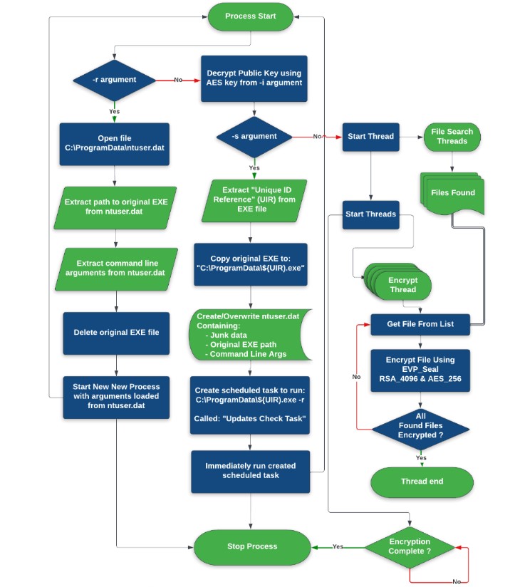 En mode configuration, il crée un fichier appelé C:ProgramDatantuser.dat qui contient des données de configuration chiffrées pour le ransomware. Il crée ensuite une tâche planifiée qui exécute le ransomware. Lorsqu’il est exécuté avec l’option de chiffrement, le binaire du ransomware extrait et déchiffre une clé publique RSA codée en dur. Il commence ensuite à générer des clés AES pour le chiffrement des fichiers, et ces clés sont ensuite chiffrées avec la clé publique RSA. Le processus s’appuie sur l’implémentation Envelope de la bibliothèque OpenSSL, ce qui signifie que le fichier chiffré résultant contiendra également la clé AES chiffrée qui a été utilisée pour chiffrer le fichier. Pour récupérer la clé AES, l’utilisateur a besoin de la clé RSA privée, qui est entre les mains des attaquants.
