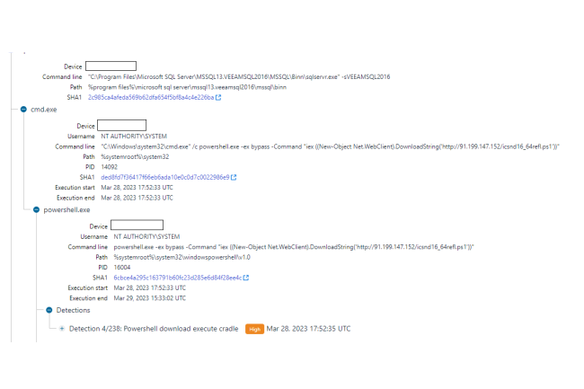 Les experts ont mené une analyse forensique de deux serveurs Veeam compromis. Les résultats montrent que le processus SQL Server “sqlservr.exe” lié à l’instance Veeam Backup a été utilisé pour exécuter un script shell batch, qui à son tour a téléchargé et exécuté un script PowerShell directement en mémoire. Ce dernier était POWERTRASH, un chargeur de malware caché qui a été attribué à FIN7 dans le passé.