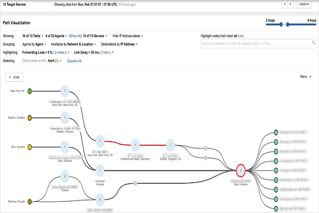 « Ces fournisseurs mondiaux sont difficiles à submerger par des attaques DDoS au niveau du réseau car ils sont très distribués. ThousandEyes n’a donc pas observé de comportement indiquant que les sites surveillés étaient indisponibles en raison de problèmes de réseau », a-t-elle ajouté. « Les fournisseurs mondiaux disposaient aussi de ressources pour se défendre contre les attaques au niveau de la couche applicative, qui sont plus difficiles à bloquer. Il s’agissait notamment de filtrer le trafic illégitime à l’aide de pare-feu d’application web et de valider les visiteurs des sites pour s’assurer qu’il ne s’agissait pas de robots », a aussi expliqué Angélique Medina. Ce n’était pas le cas pour les sites hébergés en Ukraine, où les problèmes liés au réseau étaient plus fréquents. ThousandEyes a observé des niveaux élevés de perte de paquets indiquant qu’un site utilisait le protocole BGP (Border Gateway Protocol) pour bloquer tout le trafic en direction du site, parfois pendant plusieurs jours. « Il y avait donc beaucoup de problèmes de perte de trafic, par exemple, mais nous n’avons pas vraiment observé cela pour les sites hébergés au niveau mondial ou délivrés au niveau mondial », a déclaré par ailleurs Mme Medina.
