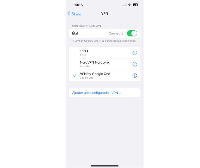 Le VPN de Google vient s’ajouter à la liste des services déjà installés dans l’onglet VPN d’iOS. (Crédit LMI)
