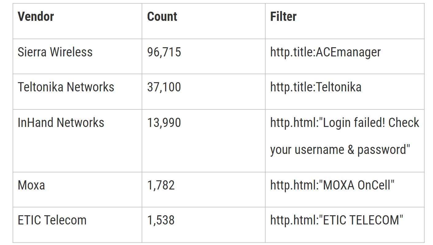 Ces terminaux, comme tout autre connecté à Internet, augmentent la surface d’attaque des réseaux OT et affaiblissent les contrôles de sécurité traditionnellement mis en place par les entreprises, offrant ainsi aux attaquants une option de contournement vers les niveaux inférieurs des réseaux OT. « En utilisant des moteurs de recherche comme Shodan, nous avons observé une exposition généralisée des passerelles et routeurs cellulaires industriels, ce qui les rend faciles à découvrir et potentiellement vulnérables à l’exploitation par des acteurs de la menace », indiquent les chercheurs d’Otorio dans leur rapport.