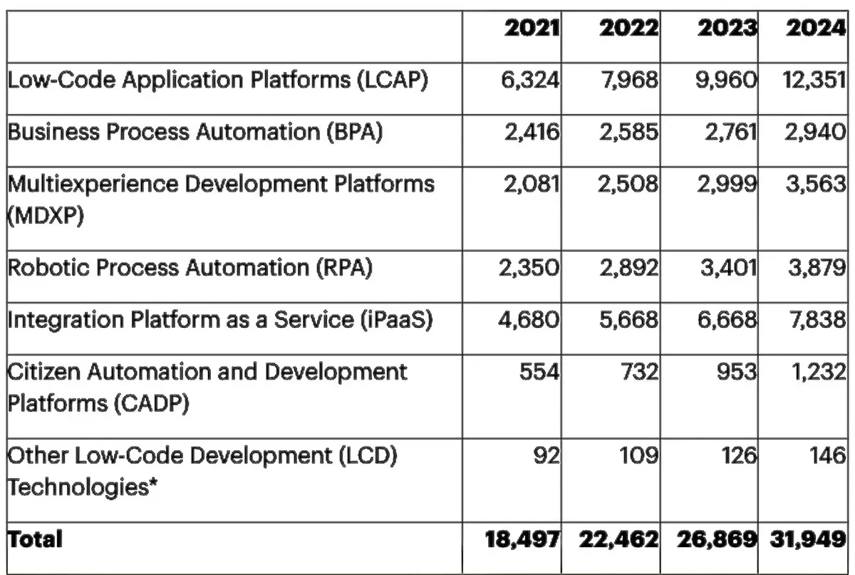 Revenus des technologies de développement low-code (en millions de dollars). (Crédit : Gartner)