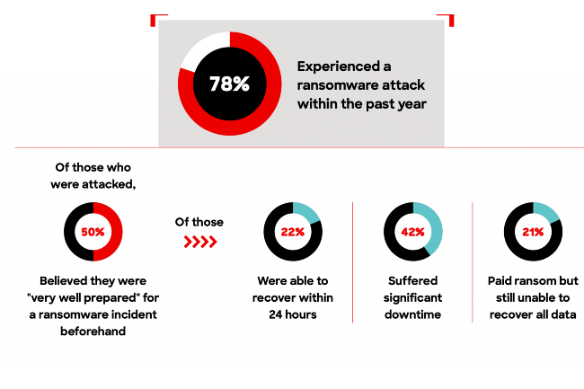 L’étude révèle également que les rançongiciels demeurent une menace majeure : 27 % des sociétés interrogées ont signalé une attaque au cours de l’année écoulée. Parmi les entités touchées, 80 % (entreprises assurées et non assurées) ont payé une rançon pour tenter de récupérer ou de protéger leurs données critiques. Et seulement 60% ont réussi à récupérer tout ou partie des données.