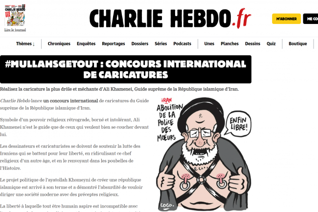 Pour rappel, en décembre 2022, Charlie Hebdo a lancé un concours international de caricatures « ridiculisant » le Guide suprême iranien Ali Khamenei, pour coïncider avec le huitième anniversaire de l’attaque des bureaux du journal par des terroristes. Le concours a été publiquement critiqué par le ministre iranien des Affaires étrangères, Hossein Amir-Abdollahian. Le 4 janvier, ce dernier a tweeté : « L’action insultante et discourtoise de la publication française […] contre l’autorité religieuse et politico-spirituelle ne sera pas […] laissée sans réponse ». Le même jour, il a convoqué l’ambassadeur de France en Iran pour « l’insulte » de Charlie Hebdo. Effet boule de neige, le 5 janvier, l’Iran a fermé l’Institut français de recherche en Iran dans ce que le ministère iranien des Affaires étrangères a décrit comme une « première étape », et a déclaré qu’il « poursuivrait sérieusement l’affaire et prendrait les mesures nécessaires ».