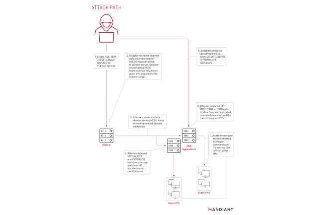 L’histoire de cette affaire débute en juin 2023 où Mandiant a documenté la manière dont le groupe chinois qu’il suit sous le nom de UNC3886 a exploité une vulnérabilité zero day de contournement d’authentification dans VMware Tools (CVE-2023-20867) pour déployer des portes dérobées à l’intérieur de machines virtuelles invitées à partir d’hôtes ESXi compromis. Le flux d’attaque décrit par Mandiant a commencé par l’accès des pirates aux serveurs vCenter, puis l’utilisation de techniques connues pour extraire les informations d’identification en clair du compte vpxuser pour tous les hôtes ESXi attachés au serveur.