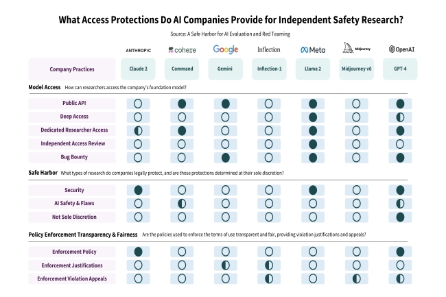 Si la lettre reconnaît et se réjouit du fait que certains fabricants de genAI disposent de programmes spéciaux pour permettre aux chercheurs d’accéder à leurs systèmes, elle leur reproche aussi d’être trop restrictifs quant aux personnes qui peuvent ou ne peuvent pas voir leur technologie. Les chercheurs ont notamment cité les entreprises d’IA Cohere et OpenAI comme des exceptions à la règle, « même si une certaine ambiguïté subsiste quant à la portée des activités protégées ». Cohere autorise les « tests de résistance intentionnels de l’API et les attaques adverses » à condition que les vulnérabilités soient divulguées de manière appropriée (sans promesse légale explicite). Et OpenAI a élargi sa sphère de sécurité pour inclure la « recherche sur la vulnérabilité des modèles » et la « recherche universitaire sur la sécurité des modèles » en réponse à une première version de notre proposition.