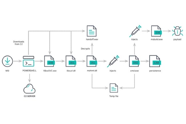 Selon eux, l’infection se déroule en plusieurs étapes, en commençant par un exécutable poseur. Le lancement du fichier MSIX ouvre une fenêtre invitant à accepter l’installation, qui aboutit finalement à un téléchargement furtif de Ghostpulse. Lors de la première étape, le programme d’installation télécharge un fichier TAR (Tape archiver), qui est un exécutable se faisant passer pour le service Oracle VM VirtualBox (VBoxSVC.exe), sauf qu’en réalité, il s’agit d’un binaire légitime, intégré à Notepad++ (gup.exe), vulnérable au chargement latéral ou sideloading, selon les chercheurs. « PowerShell exécute le binaire VBoxSVC.exe qui charge latéralement, à partir du répertoire actuel, la DLL malveillante libcurl.dll », ont expliqué les analystes. « En minimisant l’empreinte du code malveillant crypté sur le disque, le cybercriminel est en mesure d’échapper à l’antivirus basé sur les fichiers et à l’analyse ML ».