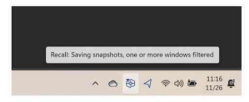 Icône de la barre des tâches de Windows Recall, la fonctionnalité qui enregistre l’activité de l’utilisateur pour simplifier la recherche d’informations. (Crédit photo: Mark Hachman)