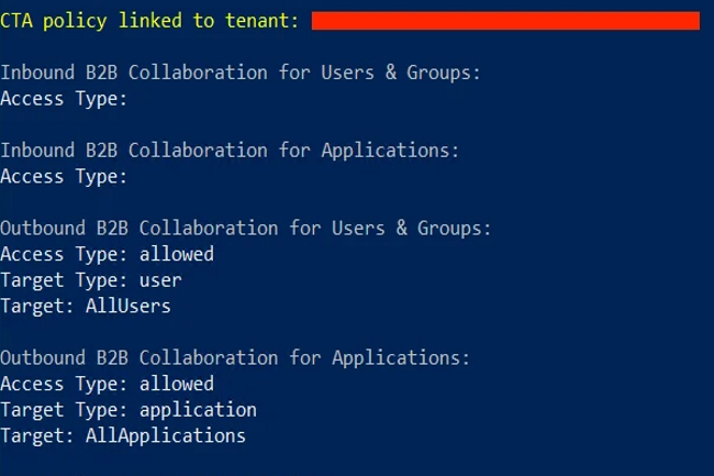 Pour qu’une attaque fonctionne, les deux tenants doivent disposer de licences Azure AD Premium P1 ou P2 incluant l’usage de la CTS. L’attaquant doit avoir accès à un compte avec un rôle d’administrateur de sécurité pour configurer les politiques d’accès interlocataires, un rôle d’administrateur d’identité hybride pour modifier la configuration de synchronisation interlocataires, ou un rôle d’administrateur cloud ou d’application pour assigner des nouveaux utilisateurs à une configuration CTS existante. Ainsi, en fonction des politiques d’accès et de la configuration CTS existantes dans un tenant, et donc des privilèges obtenus par l’attaquant, il existe différentes façons d’abuser de cette situation pour un mouvement latéral ou une persistance. Le PoC de Vectra AI suppose que le tenant dispose déjà des politiques d’accès configurées pour d’autres tenants. Dans un premier temps, l’attaquant utilisera la commande shell admin pour lister tous les instances avec lesquels le tenant actuel a des politiques d’accès. Ensuite, il examinera chacune des politiques afin d’en identifier un pour lequel une politique de sortie existe. Cela signifie que le locataire actuel est configuré pour synchroniser les utilisateurs avec ce locataire cible.
