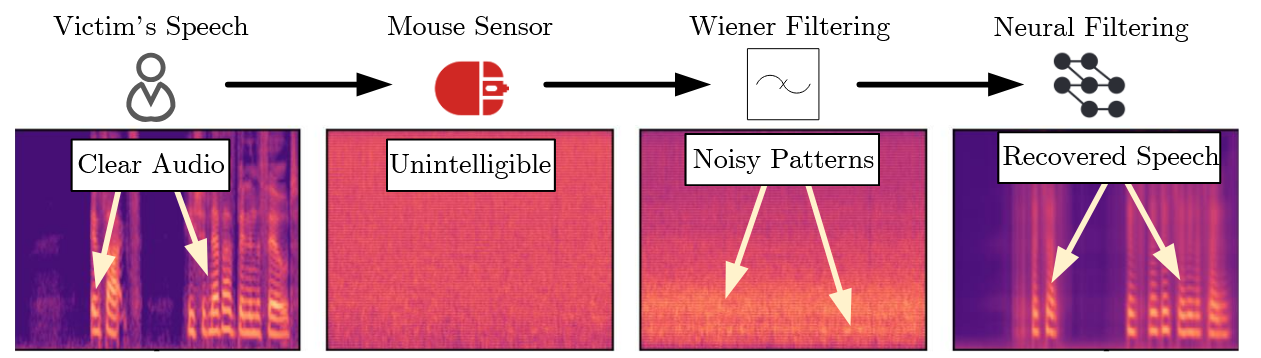 Même si les signaux captés étaient inaudibles au départ, l’équipe a pu les améliorer à l’aide d’un filtrage statistique Wiener et d’un réseau neuronal afin d’augmenter la puissance du signal par rapport au bruit. Comme le montre la vidéo de démonstration de ce processus, les chercheurs ont pu extraire des mots prononcés à partir d’un flux de données intercepté qui, au départ, semblait impossible à déchiffrer. « Grâce à notre pipeline Mic-E-Mouse, les vibrations détectées par la souris sur le bureau de l’utilisateur victime sont transformées en un signal audio complet, qui permet à un pirate d’écouter des conversations confidentielles », ont écrit les chercheurs. De plus, selon eux, ce type d’attaque serait indétectable par les systèmes de défense : « Ce processus est furtif, car la collecte des signaux de vibration est invisible pour l’utilisateur victime et ne nécessite pas de privilèges élevés de la part du pirate. »